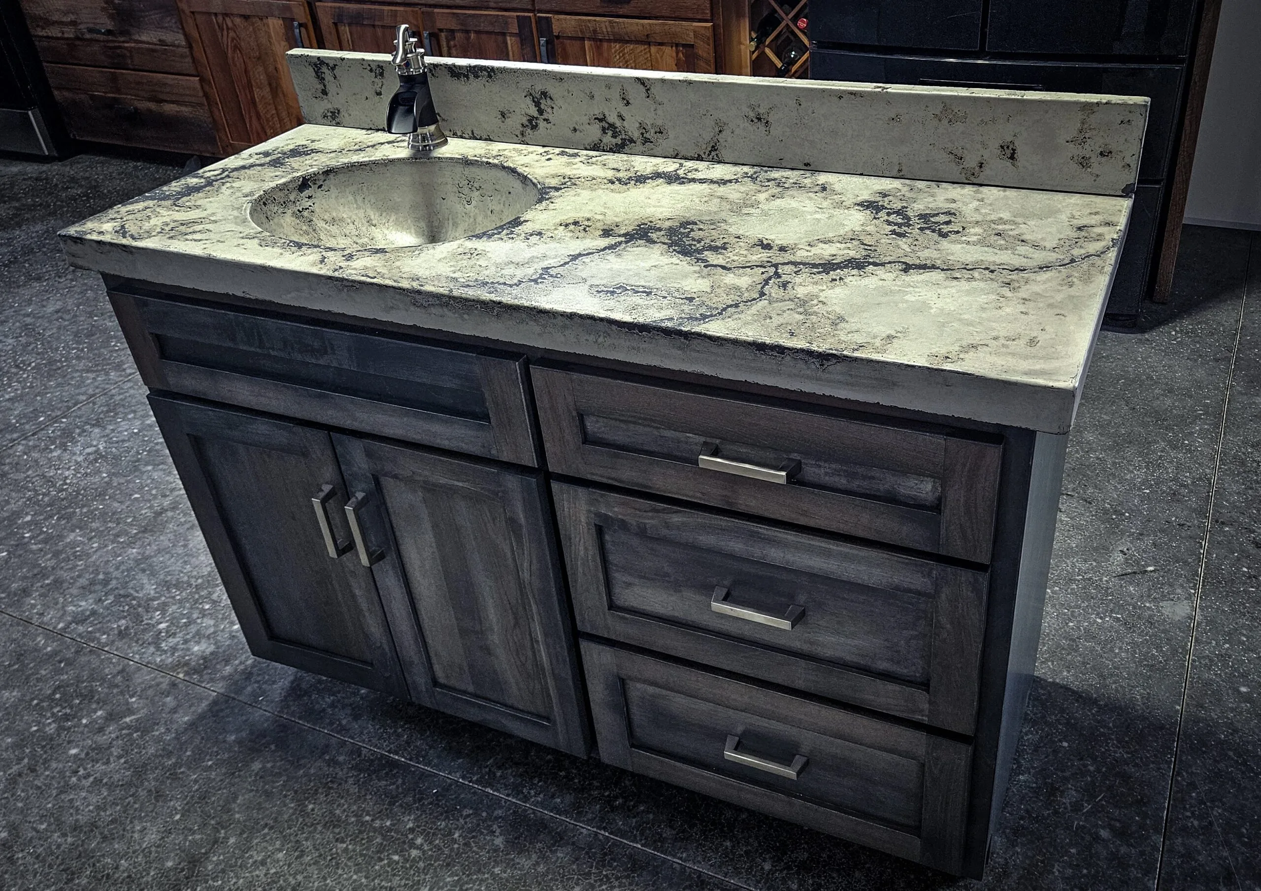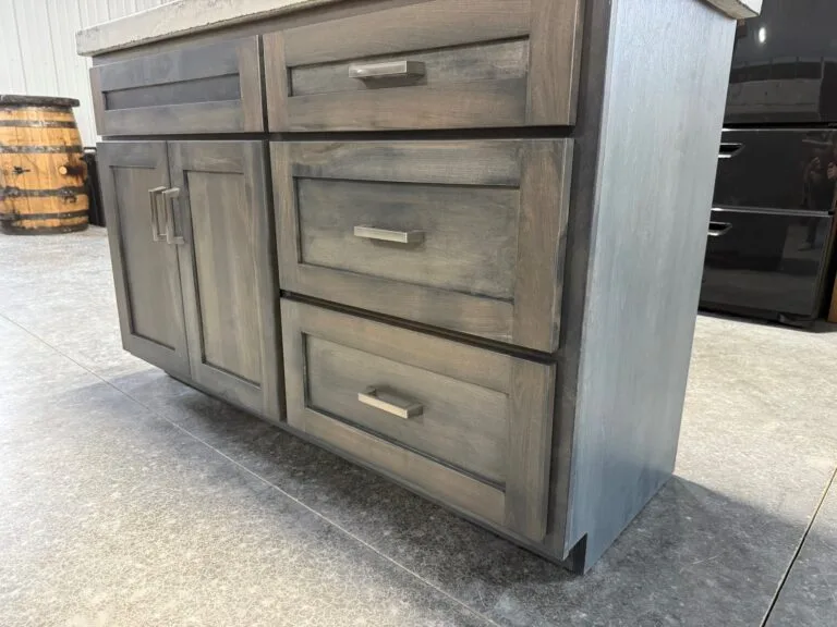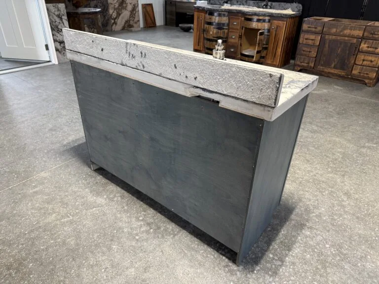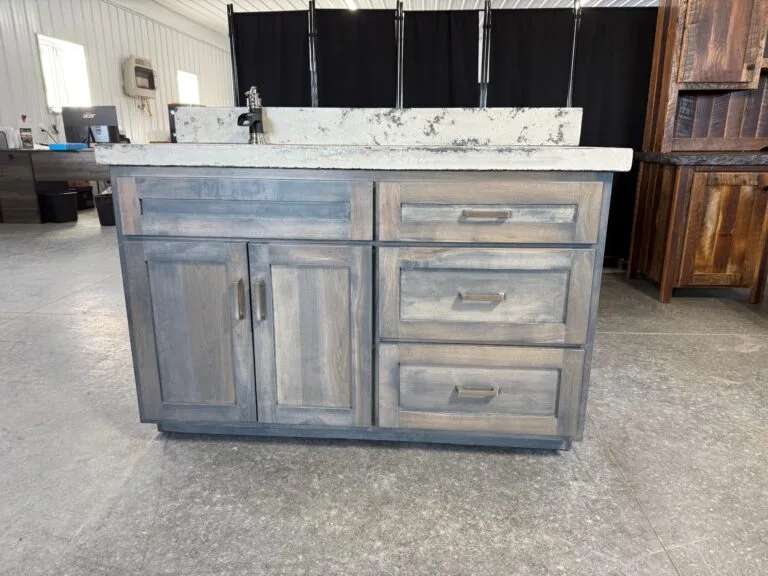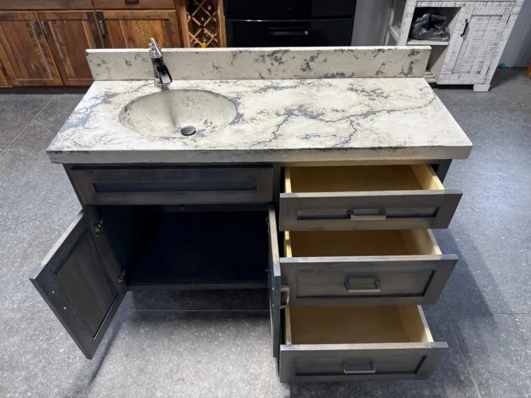 Featured in our 48” cabinet style along with 50” concrete top in our Glacier top color with sink bowl on left side, where else will you find another piece like this, handcrafted in the heart of Amish country of Holmes County Ohio, available in multiple sizes or customize your size, please feel free to request a drawing for your vanity, sink bowl placement will adjust accordingly to the size of your vanity due to plumbing configurations, doors and drawers will be installed according to the size of your vanity, faucet and drain plug included along with a 4.5 inch backsplash for your backwall, if you need a backsplash for a side wall please feel free to request one, simply messages us if you decide on a different top color.