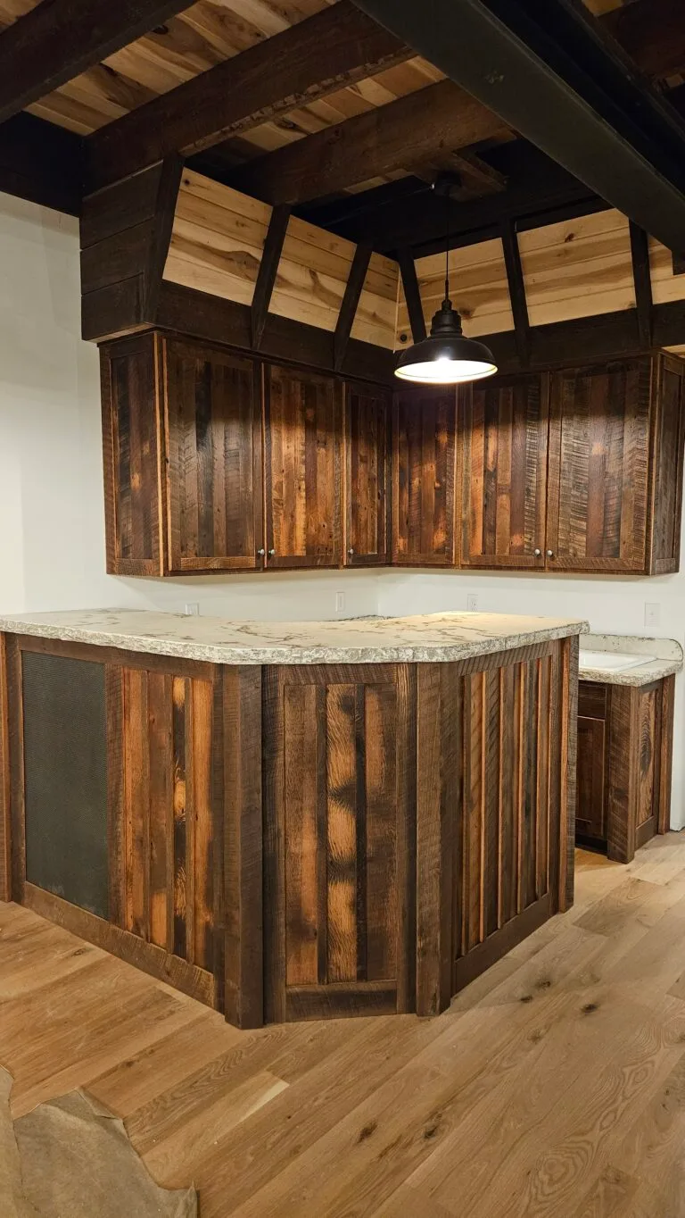 These cabinets feature reclaimed barnwood paired with concrete countertops, creating a rustic yet cohesive look. The barnwood is refurbished from old barns, and the cabinets are shown here in natural barnwood with our fruitwood stain, which adds a slightly darker tone. We also offer a natural stain option for a completely natural appearance. These examples are provided to give you an idea of the style and a ballpark price range. If you’re interested, please send us your measurements for a more accurate quote, or give us a call at 330-749-7288.