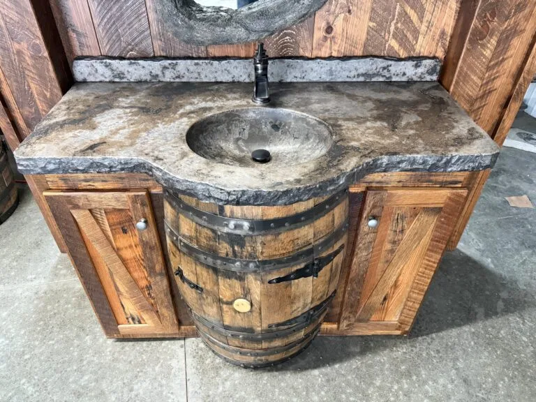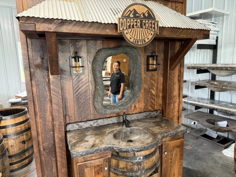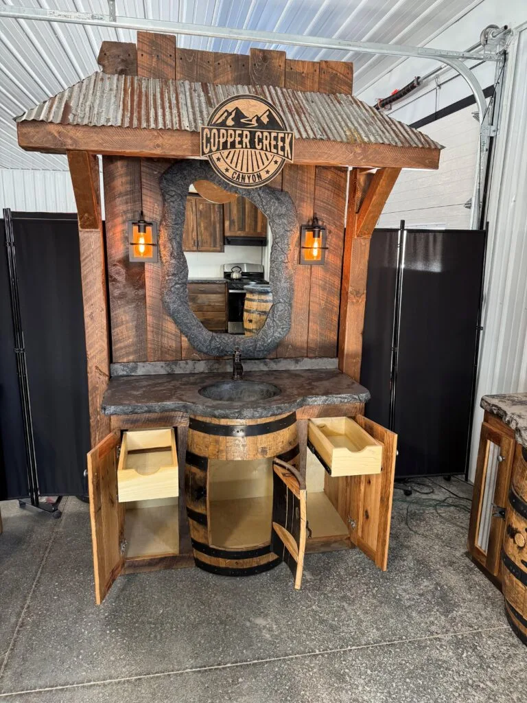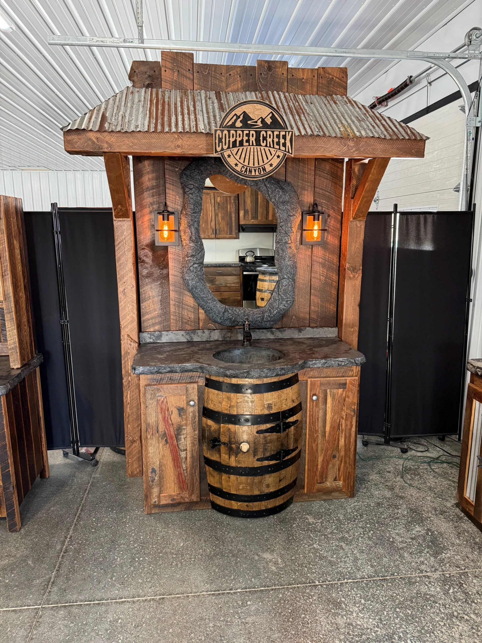 Free shipping on this one-of-a-kind concrete top vanity with a Copper Creek Canyon display. Truly, this display will stand out among the rest and will look great in your home or getaway cabin. The vanity features a charcoal concrete top, a cabinet constructed from reclaimed barnwood, an aged and refurbished whiskey barrel and finishing it off with a concrete mirror to enhance its rustic appearance. Handcrafted in the heart of Amish Country Ohio of Holmes County Ohio. You can also choose a different style of 48” vanity. Simply message us, and we will try to make the process as simple and straightforward as possible. Faucet and drain plug included.