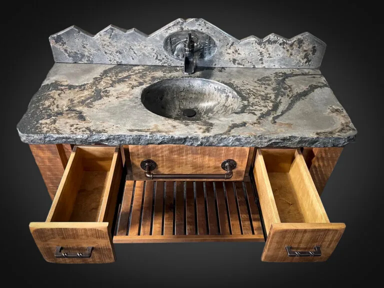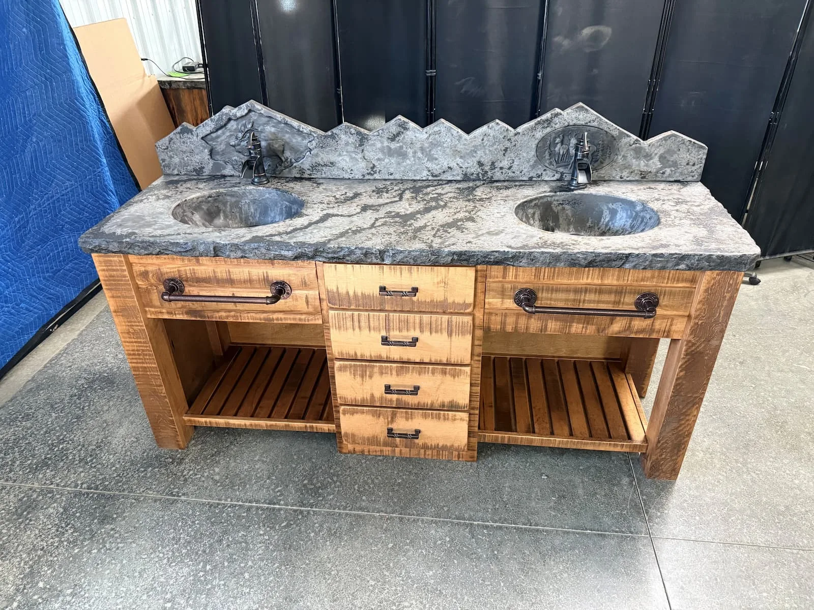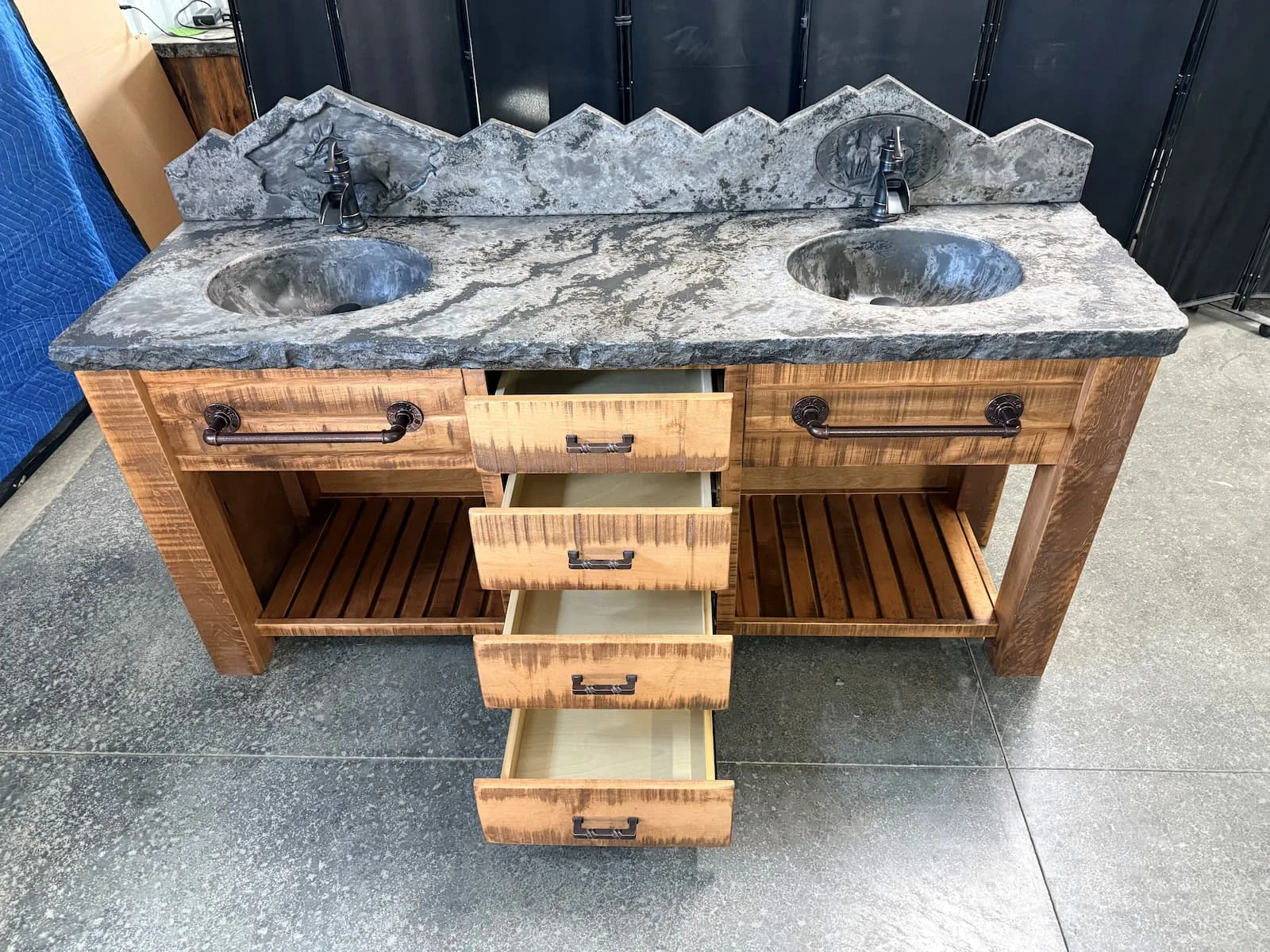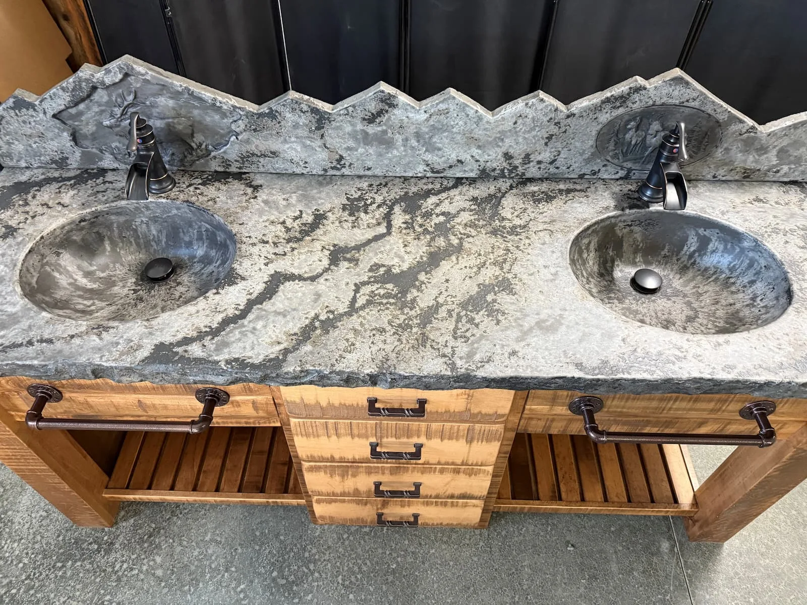 Take advantage of free shipping on this exquisite vanity with a concrete top, an exceptional piece that will enhance the aesthetic of your newly remodeled home or cabin. Presenting our latest model, it is also available in custom dimensions. Handcrafted in Holmes County, Ohio, it features a concrete top in our mocha color and a sturdy base made of rough-sawn maple with a fruitwood stain, which is also available in our Lone Oak stain upon request. You can choose your backsplash imprint; the primary picture shows our 48-inch style, and the video displays our 72-inch style. Custom sizes for your vanity are also available. If you prefer a different color concrete, upon confirmation, we can customize it to fit flush against or between your walls. The package includes the faucet and drain plug, and both drawers are fully operational. If you have any questions simply message us and we will strive to make it an easy and straight forward process for you.