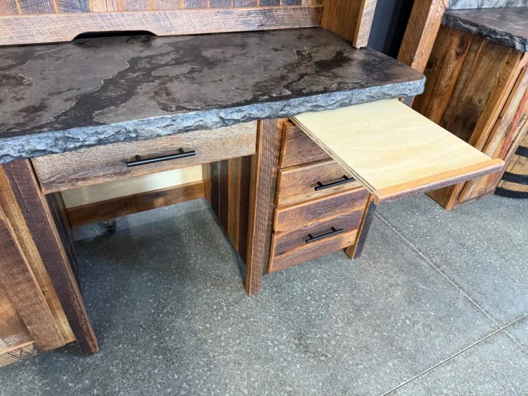 Enjoy free shipping on this exquisite barnwood desk with a concrete top that exudes character, showcased in our mocha concrete color. It offers a clean yet rustic appearance. Manufactured in the heart of Amish country of Holmes County Ohio.